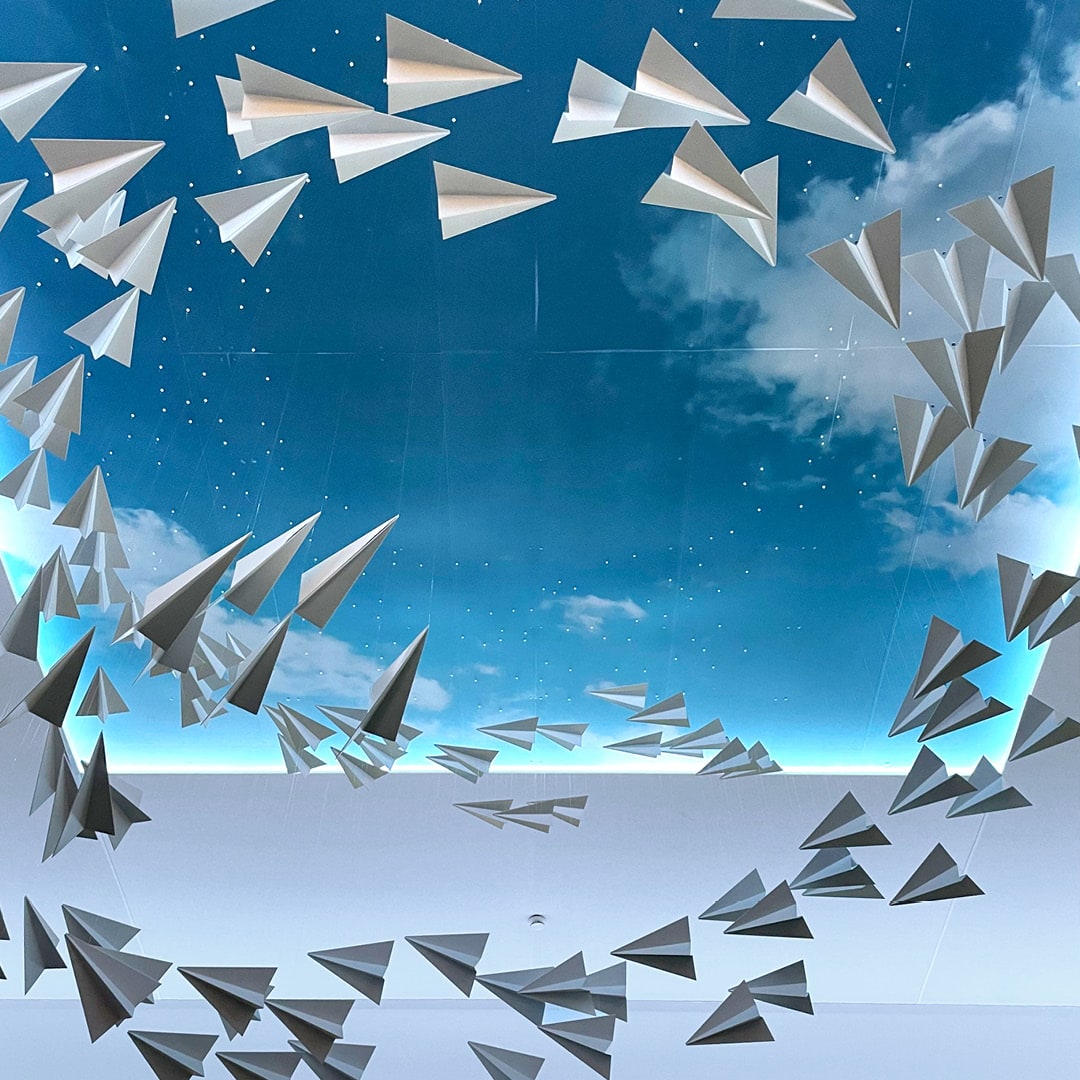 Développement, production et installation d’une mise en scène aérienne et poétique au cœur du stand. Un tourbillon d’avions en « papier » suspendus, évoluant dans un ciel azur, capte le regard et évoque légèreté et évasion.