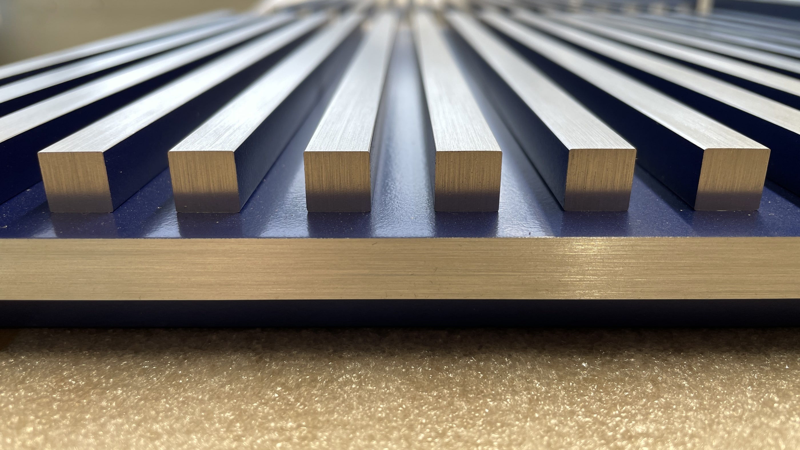 Production de PLV en métal peint et brossé, alliant précision et raffinement.